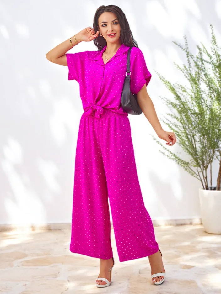 - Női elegáns szett kellemes anyagból. Az ing gombos, alján megkötővel és rövid ujjal rendelkezik. Széles nadrág derékban gumival. Az egész szettet strasszok díszítik!