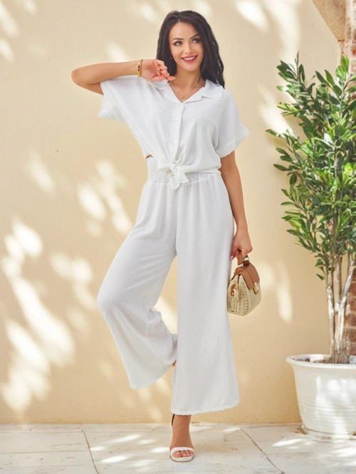 - Női elegáns szett kellemes anyagból. Az ing gombos, alján megkötővel és rövid ujjal rendelkezik. Széles nadrág derékban gumival. Az egész szettet strasszok díszítik!