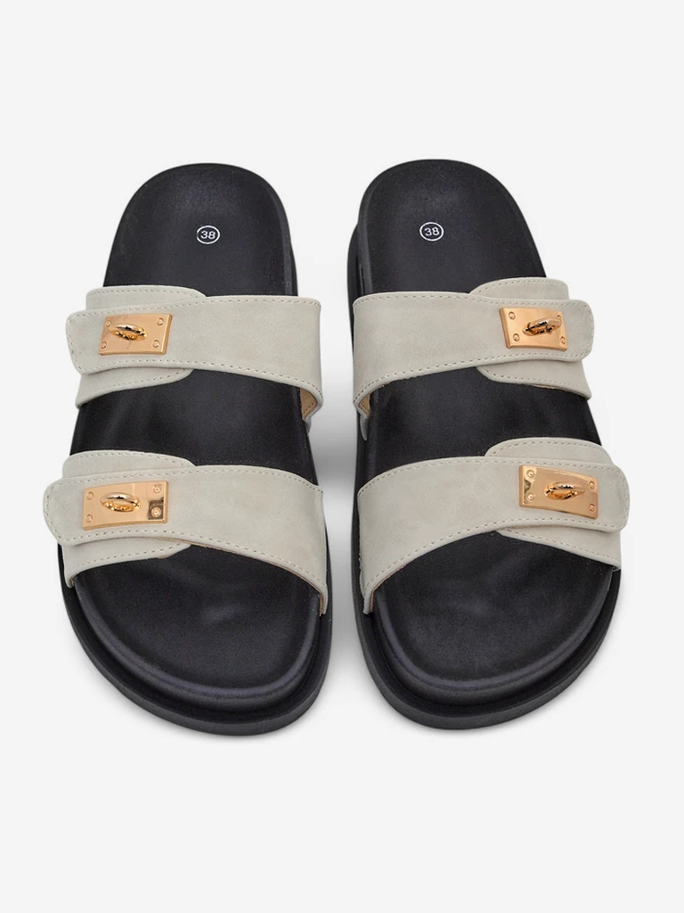 • A vastagabb talpú papucsok a stílus és a kényelem kombinációját jelentik. A matt öko-bőr pánt és a csatok varázst adnak, kiemelve az eleganciát. Az öko-bőr talpbetét minden lépésnél puhaságot és kényelmet biztosít. Ezek a papucsok tökéletesek a nyári napo