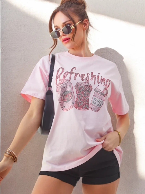 - Női pamut póló strasszokkal díszített mintával, amely a kényelmet egy finom csillogással ötvözi. Tökéletes a szabadidős stílusokhoz, egyedi bájat ad bármilyen megjelenésnek.