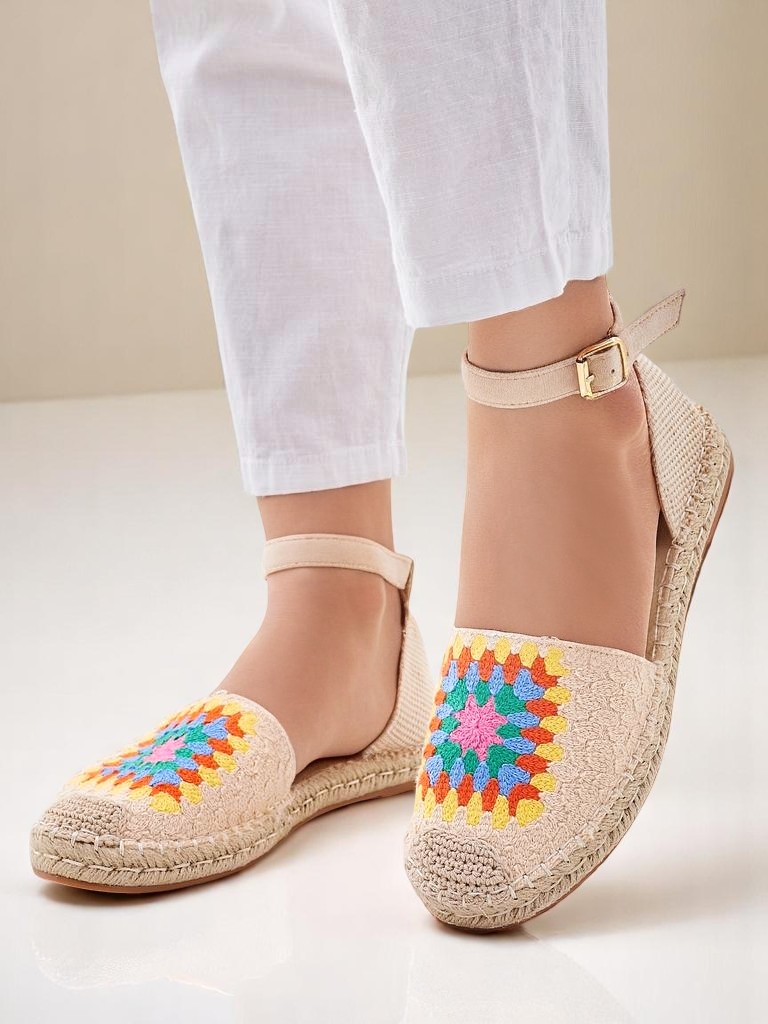 - Egyedi női espadrille dekoratív hímzéssel. Az egész modell kellemes anyagból készült. A zsineggel díszített lapos talp kényelmet biztosít. Csattal rögzíthető. Tökéletes kiegészítő a nyári öltözetekhez!