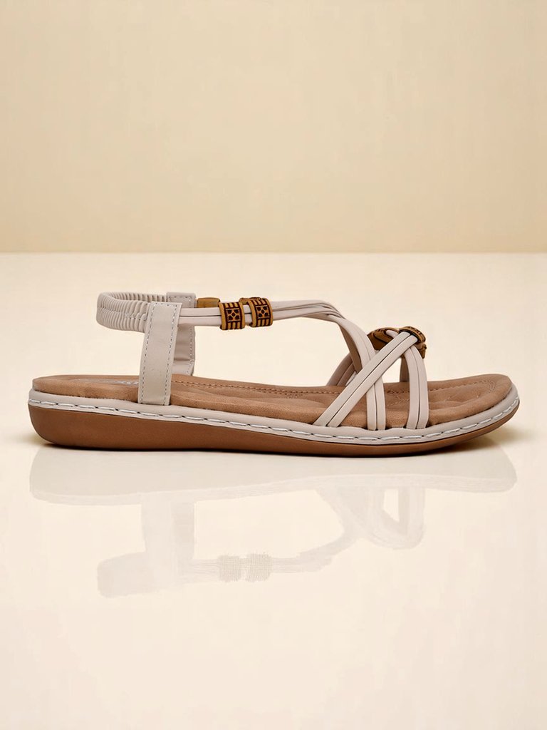 • Női lapos talpú szandál - ideális választás a forró nyári napokra. A pántok kellemes tapintású, ökológiai bőrből készültek. Az eleje elegáns, fonott pántokkal és gyöngy díszítéssel van ellátva. Felbújós modell.