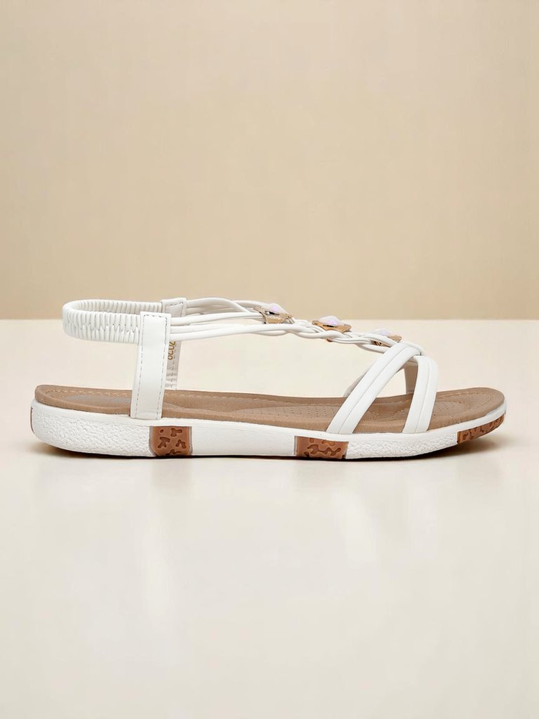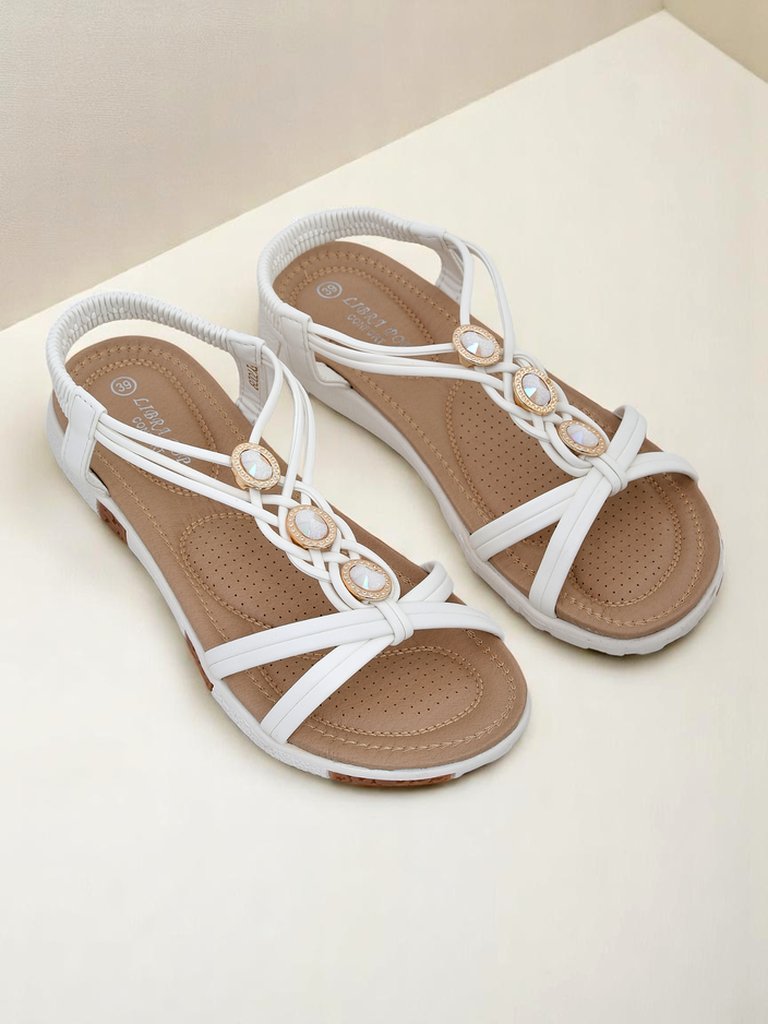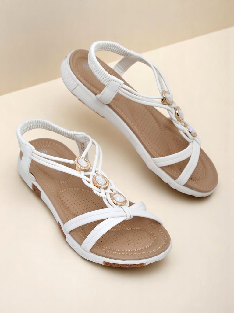 • Damskie sandałki na płaskiej podeszwie - to idealny pomysł na gorące letnie dni. Paseczki wykonane z przyjemnej skóry ekologicznej. Przód udekorowany eleganckimi, plecionymi paseczkami i ozdobami z cyrkonii. Obuwie wsuwane.