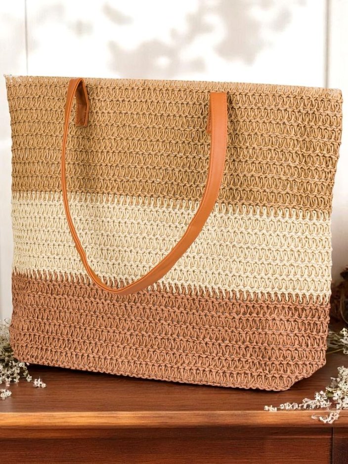 Királyi divat Nagy Szalmatáska Nőknek, Erőteljes Csíkokkal