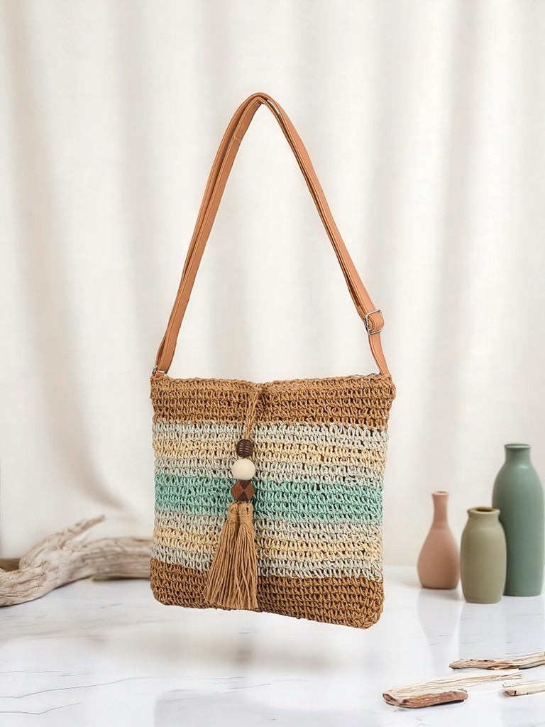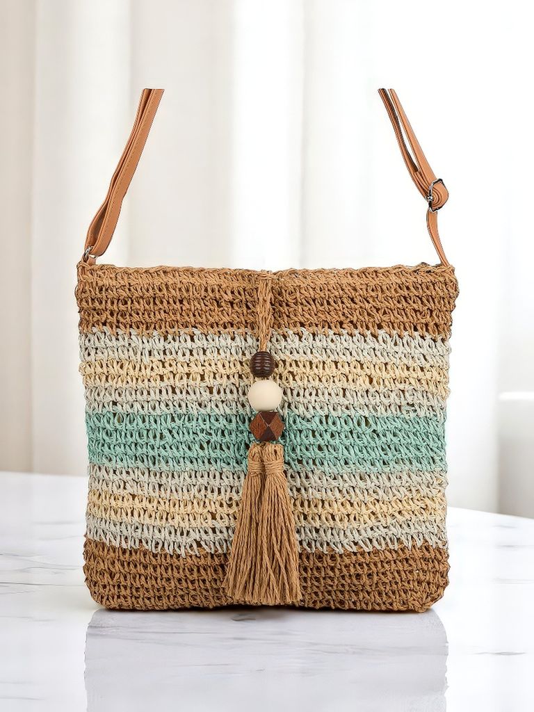 - Kicsi, fonott szalmatáska csíkos mintával és dekoratív kulcstartóval. 1 rekesszel, zsebbel, cipzárral. Stílusos és könnyű – tökéletes nyárra és sétákhoz!