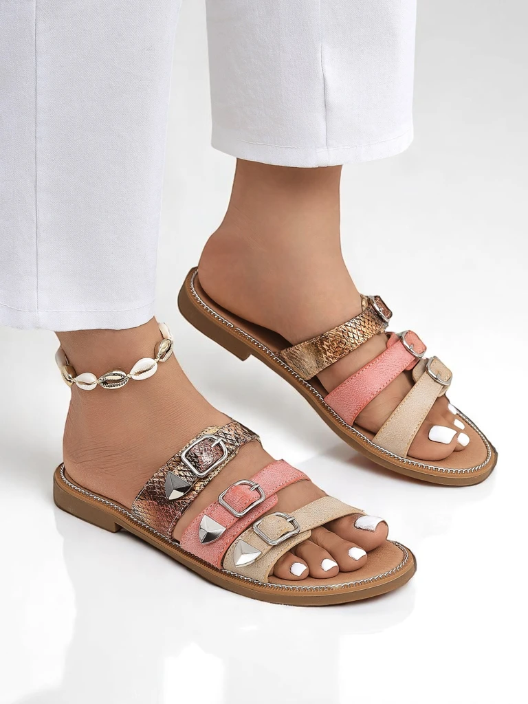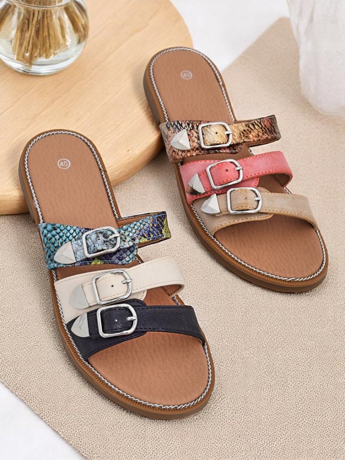 Lapos talpú, műbőr papucs dombornyomással és díszcsatokkal. Stílusos, kényelmes – tökéletes nyárra, városba és a mindennapi öltözékekhez!
