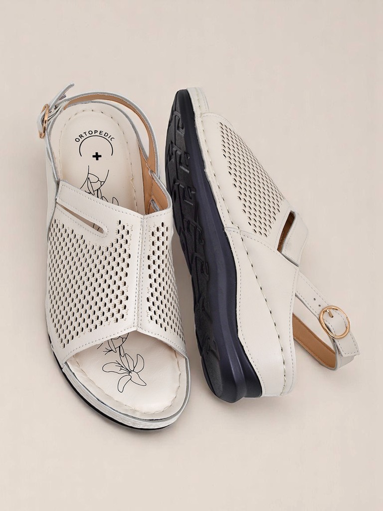 A Calcebianca szandál az olasz stílus, az antik hagyományok és a modern kényelem kombinációja. Kiváló minőségű természetes bőrből készültek, nemcsak esztétikus megjelenést, hanem tartós szilárdságot is garantálnak. A felsőrészen található lézerrel vágott minták kiváló szellőzést és divatos, finom vizuális hatást biztosítanak, amely illeszkedik a legújabb, enyhén retro jellegű nyári cipő trendekhez. A virágmintás bőr talpbetét és a finom, állítható pántos rögzítés biztosítja az egyéni igényekhez való igazodást, miközben védi a lábat és erősíti annak helyes elhelyezkedését.