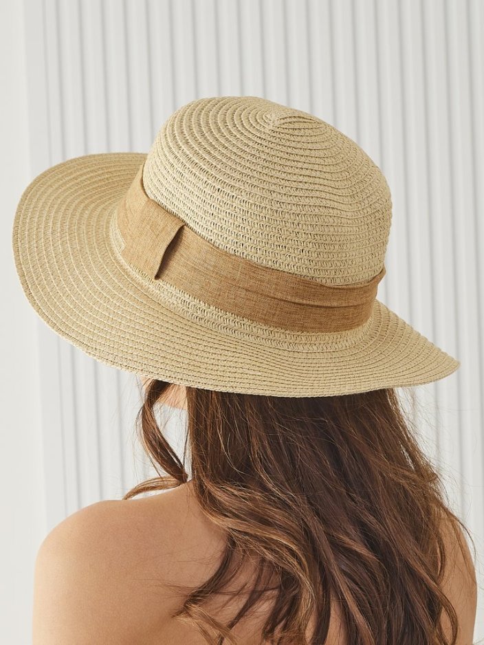 - Női szalmakalap széles karimával és egy gyönyörű textil szalaggal. Könnyű, stílusos és légáteresztő – tökéletes nyárra, sétákhoz és elegáns öltözetekhez!