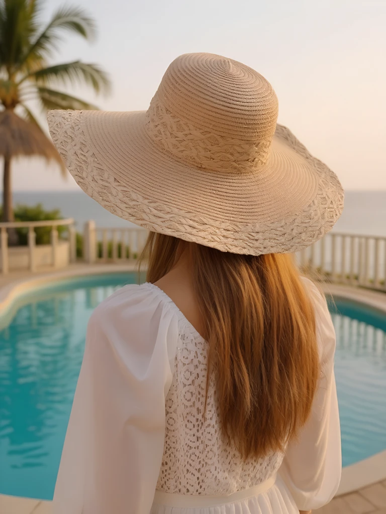 - Széles karimájú, dekoratív szövéssel díszített szalmakalap. Stílusos és légies, tökéletes választás nyárra — a természetes bájt eleganciával és hatékony napvédelemmel ötvözi.
