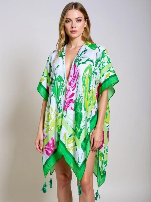 A V-nyakú, aszimmetrikus aljú, nyári strandtunika-pareo stílusos "must-have" darab a nyaraláshoz. A légies, könnyű anyag és a látványos minta kiemeli a nőiességet, a laza szabás pedig kényelmet biztosít a forró napokon. Ideális a strandra és a nyári séták