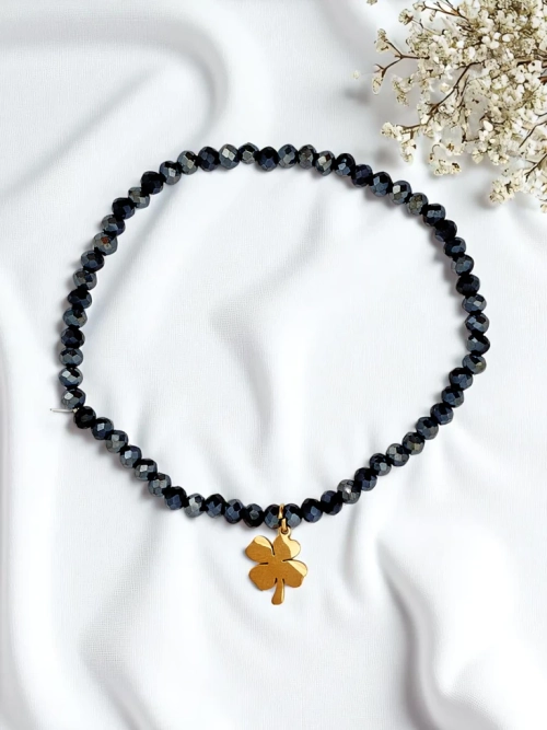 - Gyöngyös és lóhere medállal díszített karkötő, amely stílusos, szerencsét hozó talizmán. Finom és elegáns, a szerencsét, reményt és a pozitív energiát szimbolizálja. Tökéletes mindennapi viseletre, mint egy visszafogott kiegészítő, egyedi üzenettel.