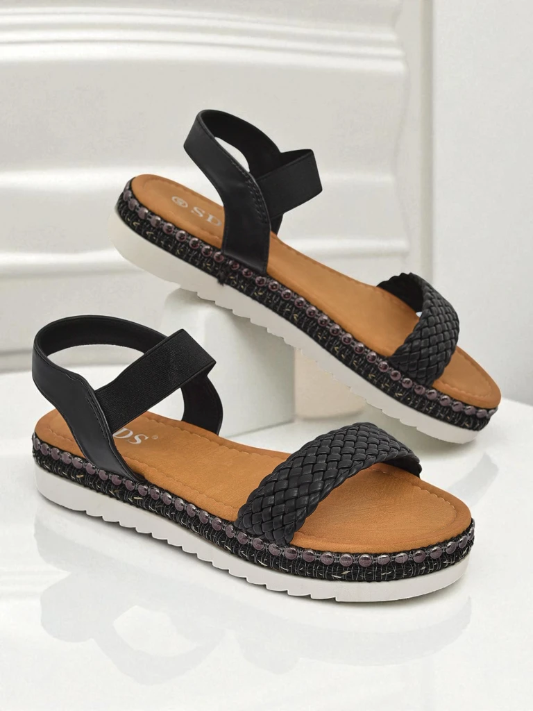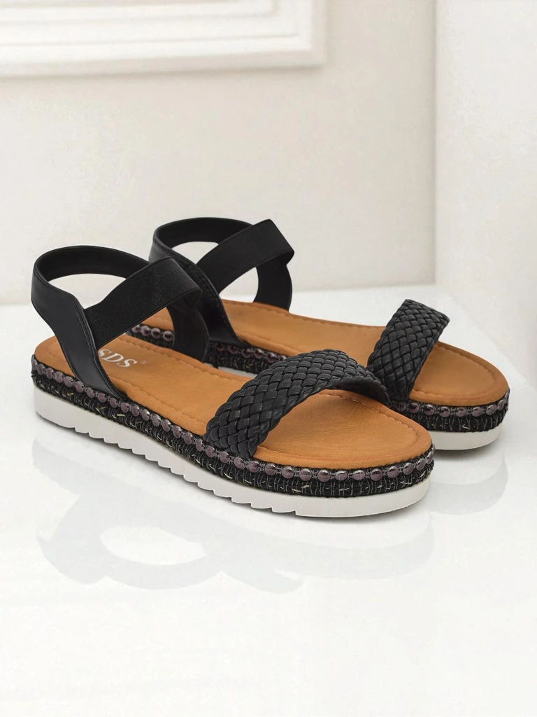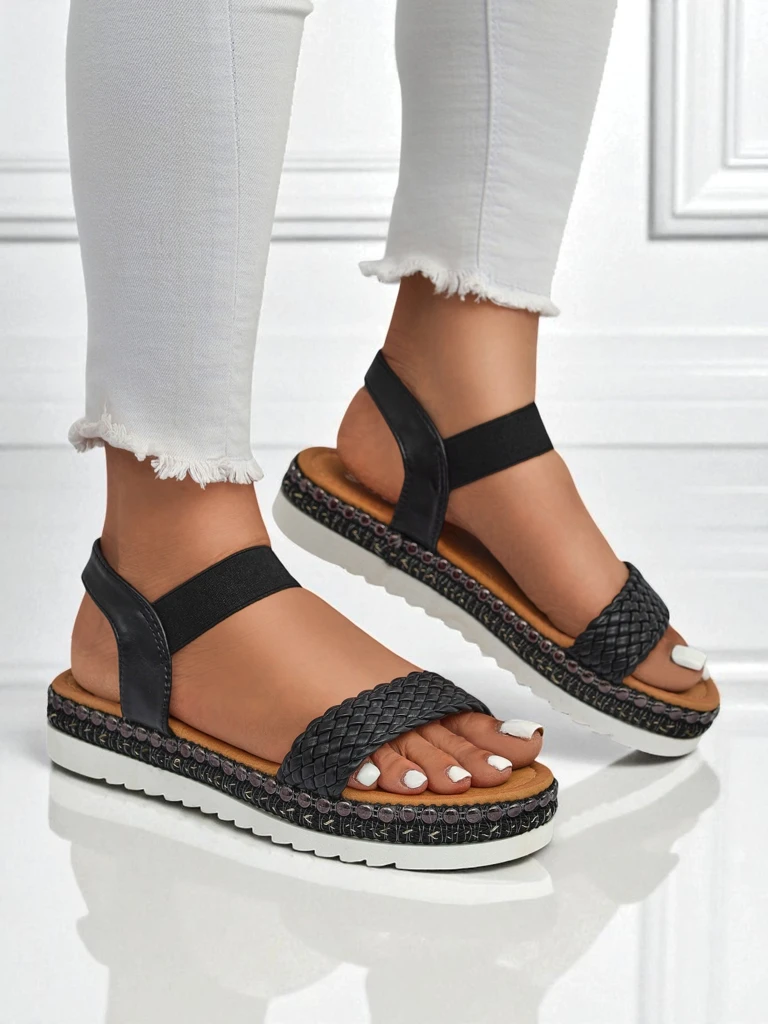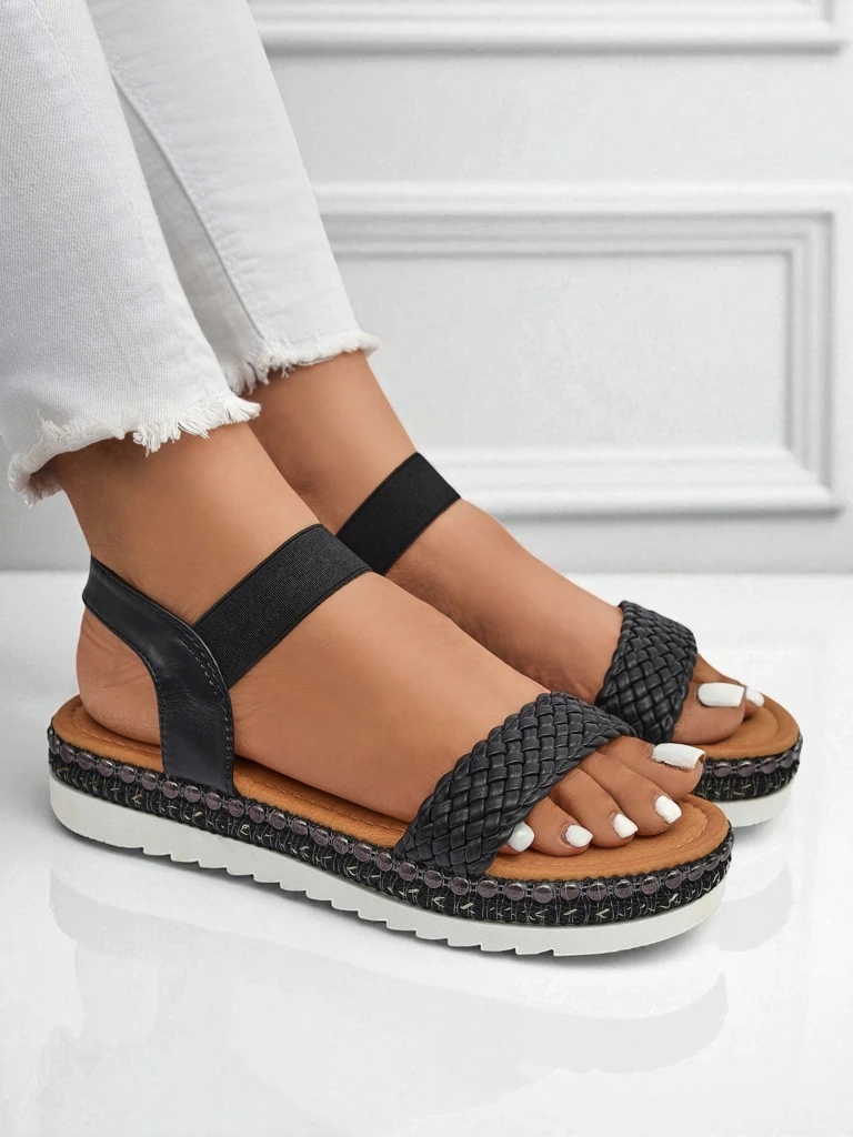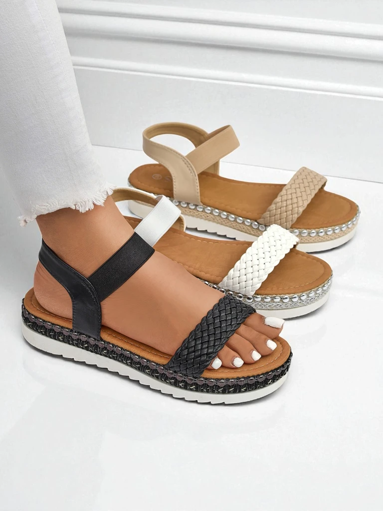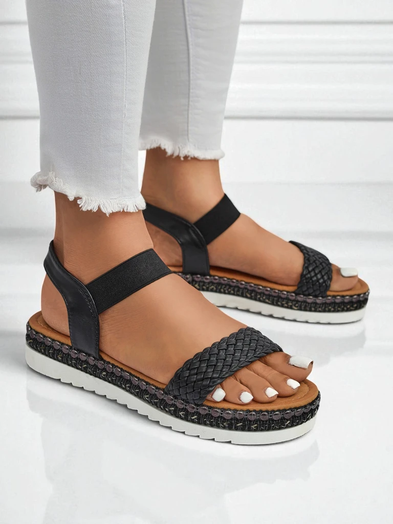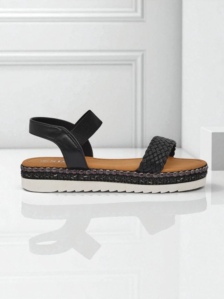Sandały Callista Nero to propozycja dla kobiet ceniących nowoczesny design połączony z klasyczną elegancją. Cholewka wykonana jest z wysokogatunkowej ekologicznej skóry – pleciony pasek zapewnia nie tylko trwałość, ale także podkreśla oryginalny, modny wygląd. Technologia produkcji łączy ręczne wykończenia z nowoczesnym szyciem podeszwy i wkładki, co zwiększa estetykę i gwarantuje wygodę przez cały dzień. Podeszwa z pianki TPR z antypoślizgowym bieżnikiem zapewnia świetną amortyzację i komfort przy każdym kroku, nawet podczas długich spacerów czy całodniowych aktywności. Wnętrze sandałów wyściełane jest miękką, oddychającą mikrofibrą. Wyjątkową ozdobą jest stylowa lamówka wokół podeszwy z subtelną aplikacją w postaci drobnych koralików, co nadaje sandałom oryginalnego charakteru, wpisując się w obecny trend „fashion details”. Sandały Callista Nero sprawdzą się doskonale na wiele okazji:1. Styl casual – połącz je z jasnymi, lnianymi spodniami oraz luźnym topem na codzienne wyjście.2. Styl boho – zestaw z letnią, zwiewną sukienką maxi i słomianą torbą. 3. Styl smart – dobierz cygaretki i elegancką koszulę na lunch lub spotkanie biznesowe w plenerze.Dzięki uniwersalnej czerni będą także pasować do klasycznych jeansów lub spódnicy mini.Aby sandały Callista Nero zachowały swój wygląd na długo, zalecamy czyścić je wilgotną, miękką ściereczką, a następnie delikatnie osuszyć. Przechowuj je w suchym miejscu, najlepiej w materiałowym woreczku. Unikaj bezpośredniego kontaktu z wodą i środkami chemicznymi. Produkt nie wymaga specjalnej konserwacji – regularne czyszczenie wystarczy, aby zachować intensywny kolor i kształt.Trendy na sezon wiosna-lato obejmują komfortowe sandały na lekko podwyższonej podeszwie, z ozdobnymi elementami oraz plecionymi paskami. Callista Nero idealnie wpisuje się w ten styl, łącząc wygodę z subtelną elegancją oraz nowoczesnymi detalami.