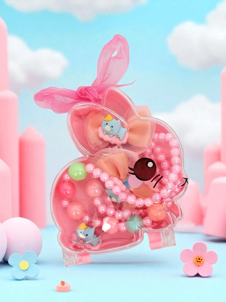 Színes gyermek ékszerszett Bambina Allegra – nyaklánc, karkötő és hajcsatok bájos nyuszis dobozban.