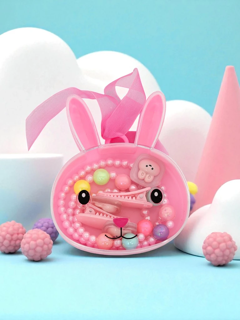 Bambina Dolce ékszerkészlet gyerekeknek – aranyos nyuszi táska, gyöngyök, klipszek, tökéletes ajándék egy kislánynak.