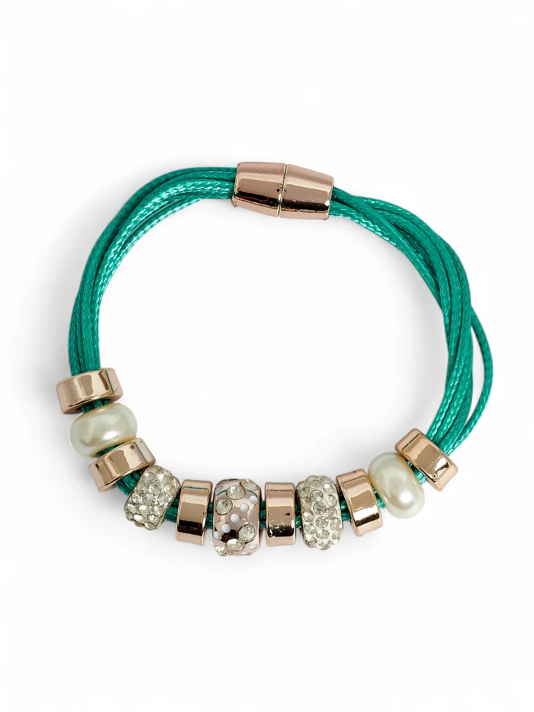 • Elegáns női karkötő zsinórokon, mágneses zárral. Ezüst gyöngyökkel és cirkóniákkal díszítve, amelyek gyönyörűen csillognak a fényben. Stílusos kiegészítő a mindennapi és esti öltözékekhez.