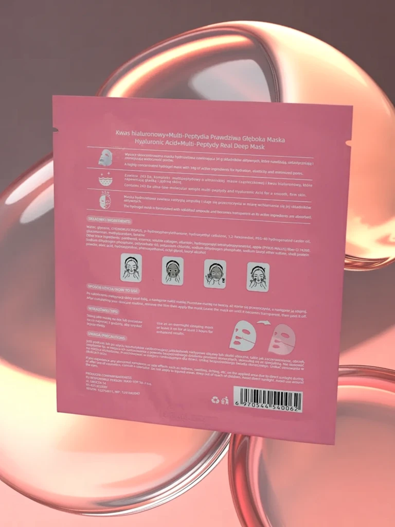 A LUXELUX Calista Real Deep arcmaszkot a bőr mély hidratálására, regenerálására és rugalmasságának javítására tervezték. Ultrapuha hidrogél anyagból készült, tökéletesen illeszkedik az arc kontúrjaihoz, biztosítva az aktív összetevők egyenletes felszívódását. A legmodernebb kozmetikai szabványoknak megfelelően készül, magas tisztasággal és biztonsággal. A maszk összetétele hialuronsavra épül – egy olyan anyagra, amelyet a kozmetikában nagyra értékelnek a bőr intenzív hidratáló és simító képessége miatt. Ezenkívül a formula többszintű peptidek komplexével van megerősítve, amelyek támogatják a bőr természetes védőgátját, serkentik a kollagéntermelést és hatékonyan minimalizálják a ráncok megjelenését.Az összetevők között megtalálható: glicerin, butilénglikol, béta-glükán, nátrium-hialuronát, peptidek, aloe vera kivonat vagy citromsav. Az ilyen jól megválasztott aktív összetevőknek köszönhetően a maszk azonnali nyugtató hatást fejt ki, csökkenti a bőrpírt, és érezhetően javítja a bőr feszességét és simaságát.- Mély hidratálás és alapos bőrregenerálás- A finom vonalak és ráncok kisimítása- Az irritációk enyhítése és a szárazság elleni küzdelem támogatása- A bőr tónusának kiegyenlítése és a bőr rugalmasságának javítása1. A maszk ideális gyors SPA-ként egy fontos esemény előtt – adj hozzá egy könnyű sminket és szájfényt, hogy ragyogó bőrt kapj.2. Kombináld egy minimalista, hétköznapi stílussal (fehér póló és farmer), hogy kiemeld a bőr egészséges, ápolt megjelenését a mindennapokban.3. Használd este egy randi előtt egy stílusos ruhával és finom kiegészítőkkel – a bőr tökéletes alapot biztosít a sminkhez. A maszkot hűvös és árnyékos helyen tárolja. Javasoljuk, hogy tisztított arcbőrre alkalmazza, hagyja hatni 20-25 percig, majd a eltávolítás után finoman ütögesse be a maradék szérumot. Kerülje a szembe jutást. Tartsa távol a közvetlen napfénytől, szobahőmérsékleten. A hialuronsav és peptidek alapú maszkok abszolút slágerek a modern, hatékony arcápolásra odafigyelők körében. Jelenleg különös hangsúlyt fektetnek az erős hidratálásra, a hidrolipid gát helyreállítására és a bőr komfortjára, ami tökéletesen illeszkedik a napi szépségápolási rutinba és az esti ápolási rituálékba.