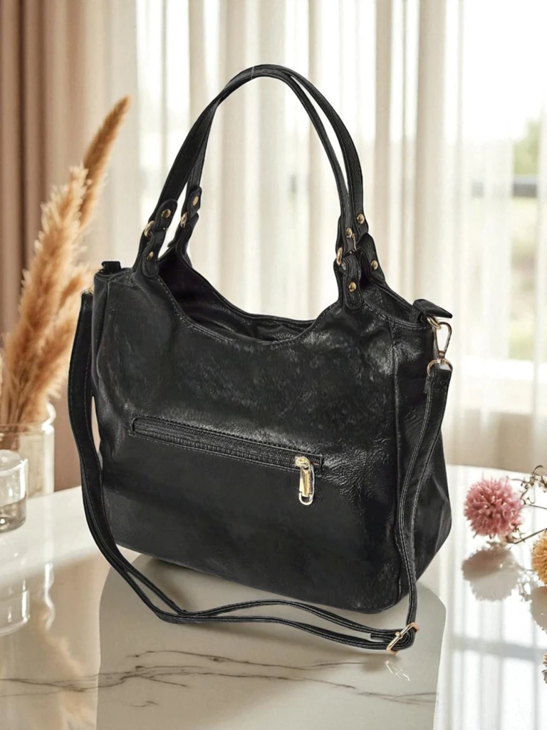 A Callista fekete női táska az elegancia és a praktikum szinonimája egyben. Gondosan válogatott, finom textúrájú ökológiai bőrből készült, ötvözi a magas minőséget a modern dizájnnal. A gyártási folyamat fejlett varrási technikákon és a részletek precíz kidolgozásán alapul, ami garantálja a tartósságot és a használatból eredő elégedettséget. Az ökológiai bőr, amelyből a táska készült, tanúsítványokkal rendelkezik, amelyek igazolják a környezetbarátságát és a felhasználó bőrének biztonságát.A Callista dizájn, amelyet a klasszikus olasz forma ihletett, kényelmes viseletet kínál két különböző fogantyúnak köszönhetően – vállon és keresztben is hordható, valamint nagy kapacitással (42x24x15 cm), ami ideális a mindennapokra és a munkába. A jól átgondolt belső elrendezés több cipzáras zsebet és egy tartós anyaggal bélelt funkcionális fő rekeszt tartalmaz, ideális helyet biztosítva a pénztárcának, telefonnak, kozmetikumoknak és egyéb szükséges apróságoknak.