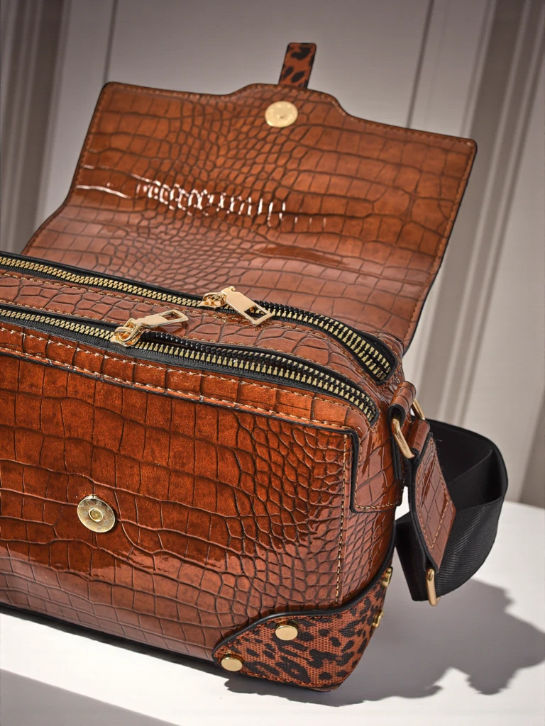 • Stílusos táska lakkozott műbőrből, dombornyomással és leopárdmintás betétekkel. 2 rekesz a jobb rendszerezéshez és levehető, állítható pánt. Merész kombinációja az eleganciának egy csipetnyi ragadozó karakterrel.