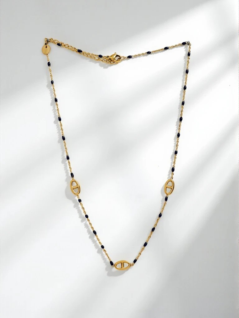 Elegáns Aurelia Nero nyaklánc – aranyozott, fekete gyöngyökkel, minden öltözék divatos kiegészítője.