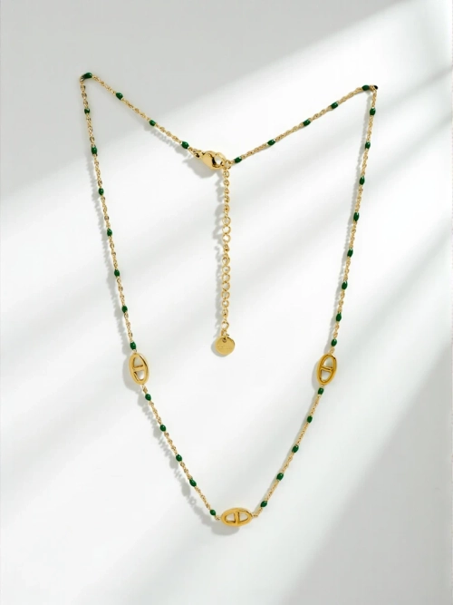 Finom, aranyozott nyaklánc zöld kövekkel – görög stílusú kiegészítő.
