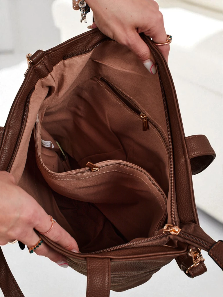 Elegáns női táska ökológiai bőrből. 1 rekesz elválasztóval, 5 zseb, levehető, állítható pánt. Ideális munkához és mindennapi használatra – tágas, divatos és praktikus.