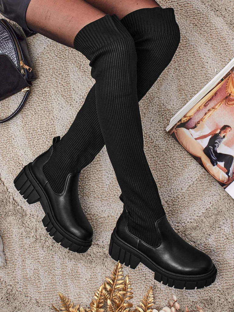 Stílusos női térd fölötti csizma lapos sarokkal. A szár rugalmas szövetanyagból készült, eco bőr betétekkel, belül szövet betét található. Felbújós modell. Tökéletes a mindennapi őszi öltözékekhez!