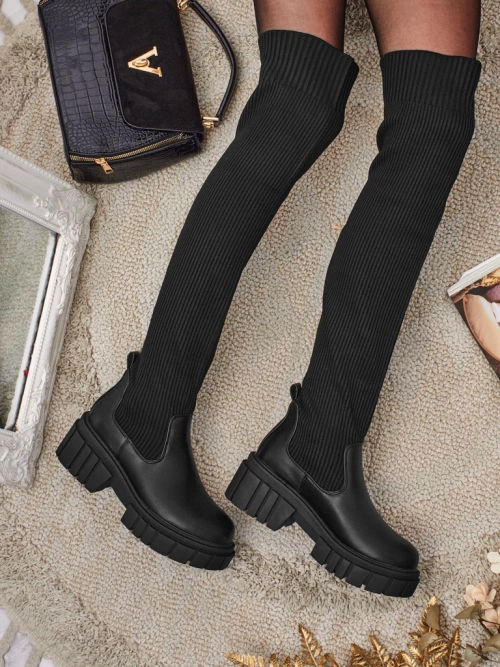 • Stílusos női térd fölötti csizma lapos sarokkal. A szár rugalmas szövetanyagból készült, eco bőr betétekkel, belül szövet betét található. Felbújós modell. Tökéletes a mindennapi őszi öltözékekhez!