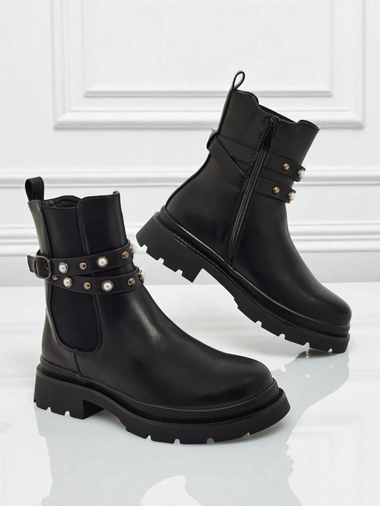 Anyag és technológia: A bokacsizmák kiváló minőségű ökológiai bőrből (PU) készültek, sima, matt felülettel. Az oldalsó rugalmas betétek (Chelsea típusú) könnyű felvételt biztosítanak, a belső cipzár pedig megkönnyíti az illeszkedést. A könnyű és ellenálló TPR/EVA anyagból készült talp mély futófelülettel garantálja a jó tapadást. A dekorációs elemek a fém szegecsekbe ágyazott műgyöngyök, antikolt arany hatással. A gyártás precíz gépi varrást és hőragasztást foglal magában a felsőrész és a talp tartós összekapcsolásához. A termék nem kozmetikum – nincsenek leírható összetevők.