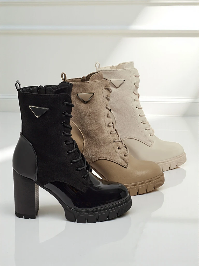 Kényelmes bokacsizmák vastag sarokkal, öko velúrbőrből és ökológiai bőrből készültek. Fűzős és cipzáras modell. Ideális választás őszre!