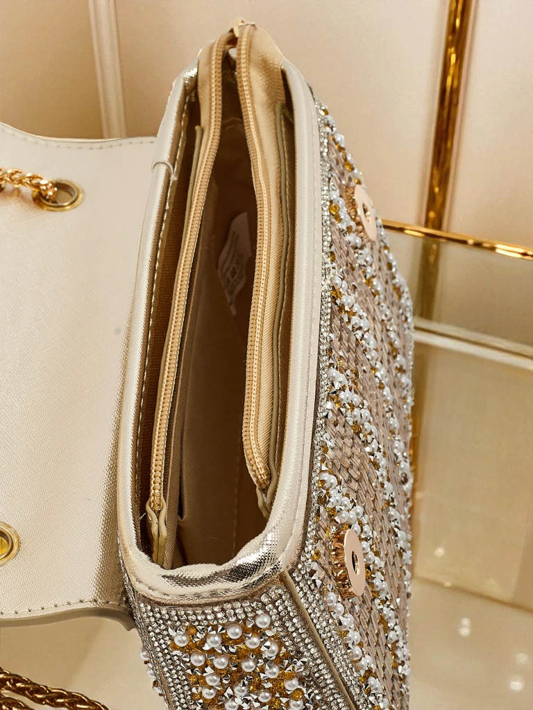 Elegáns, csillogó cirkóniákkal díszített borítéktáska, 1 rekesszel, cipzárral zárható. A stílusos fülek és a díszes lánc eleganciát kölcsönöznek. Tökéletes különleges alkalmakra – ragyogj stílusosan!