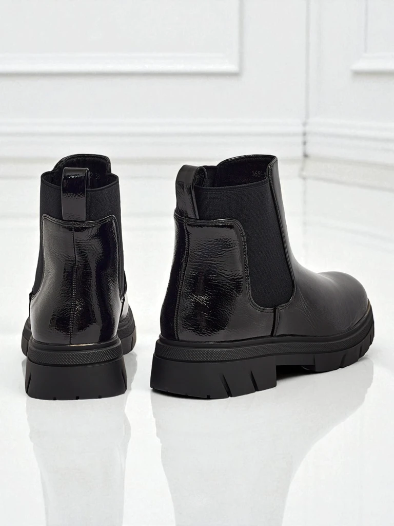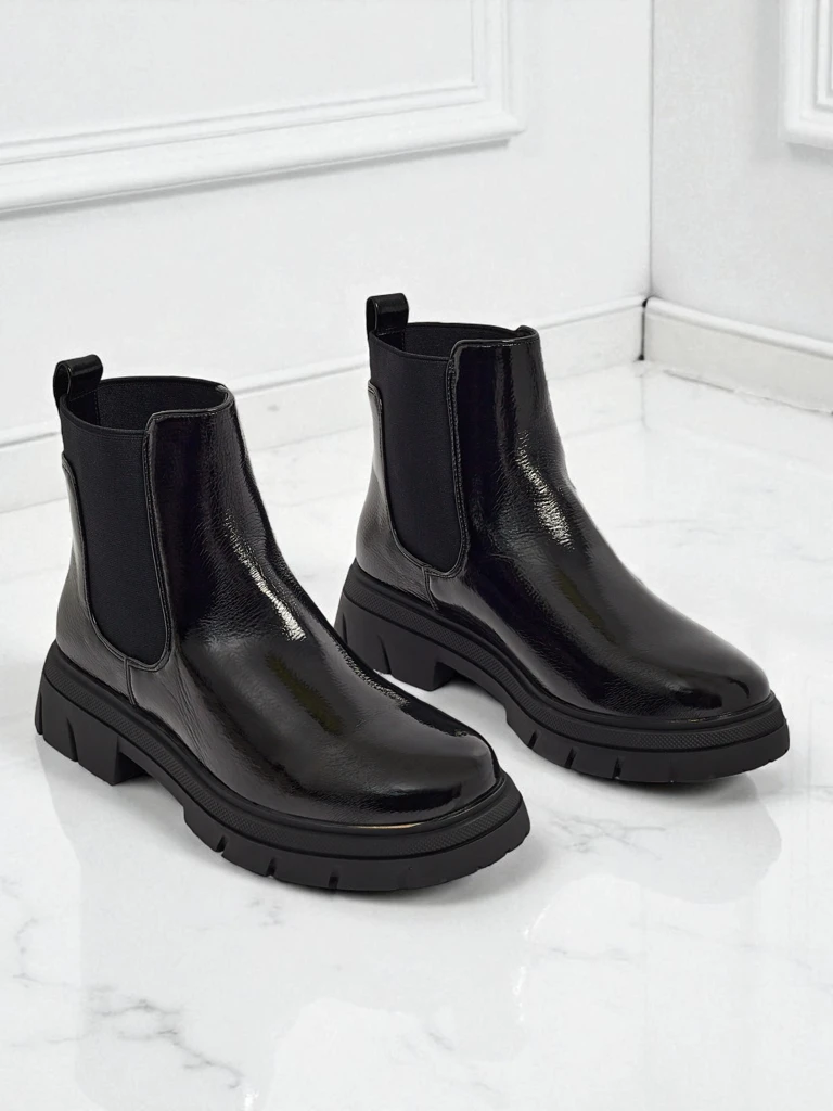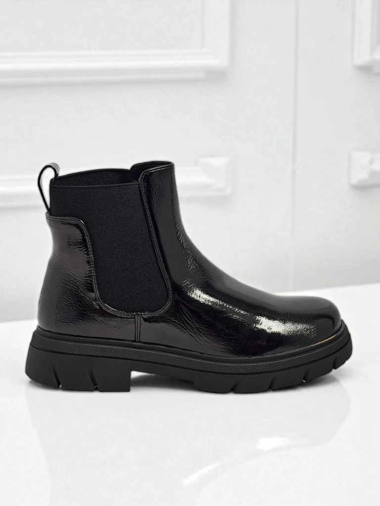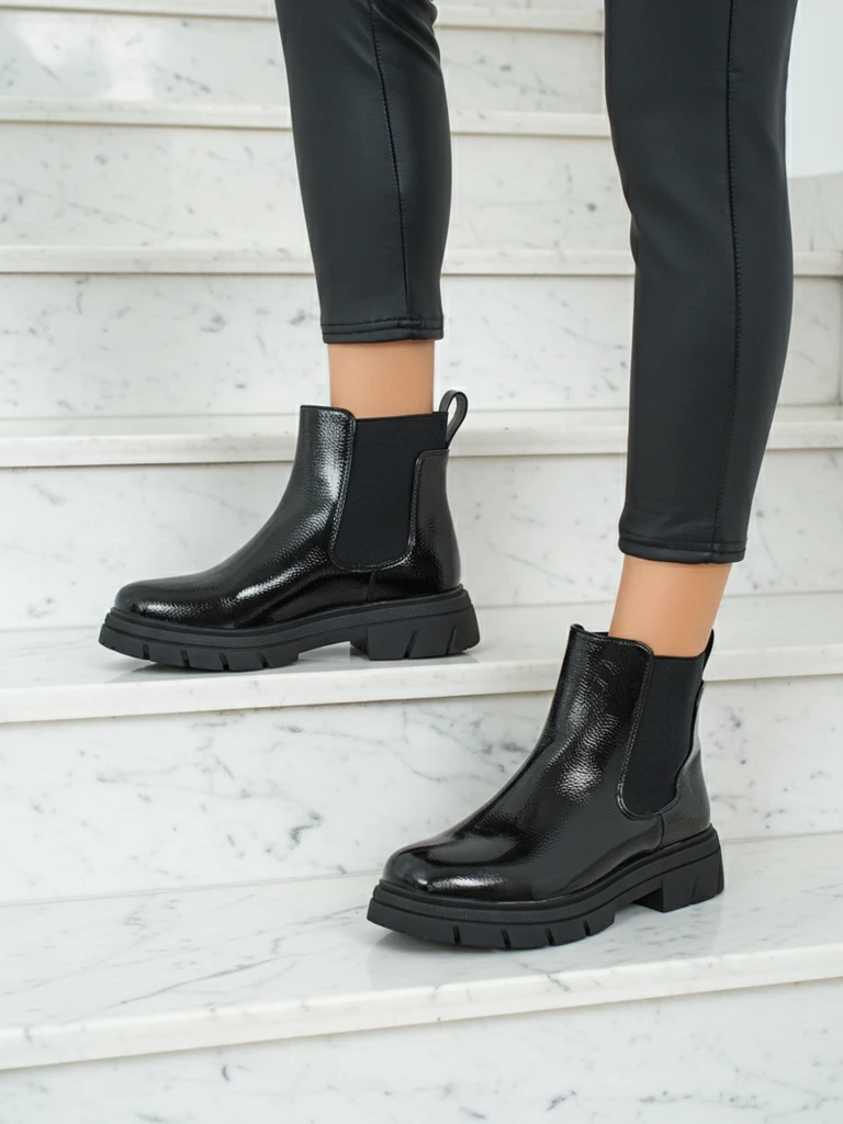 Kiváló női bokacsizmák vastagabb talppal, lakkozott műbőrből készültek. A finom bundás belső rész melegen tartja a lábat a hidegebb napokon. Felbújós modell.