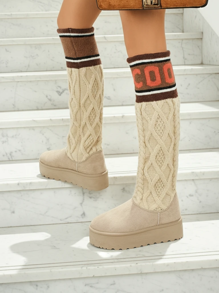 1. Długie dzianinowe sukienki i botki Medusa - połączenie wygody z elegancją.
