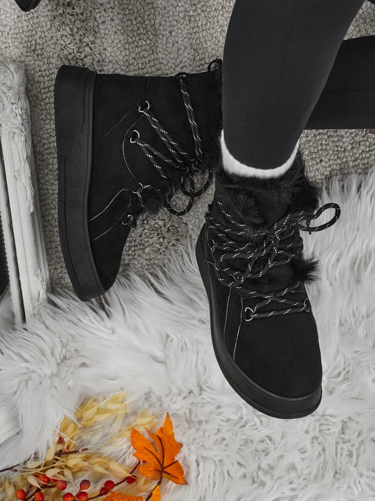 Nagyszerű női téli hócsizmák vastag platformtalppal. A felsőrész ökológiai velúrbőrből készült, a belseje szőrmével bélelt. Fűzős modell. Tökéletes alap a télre!