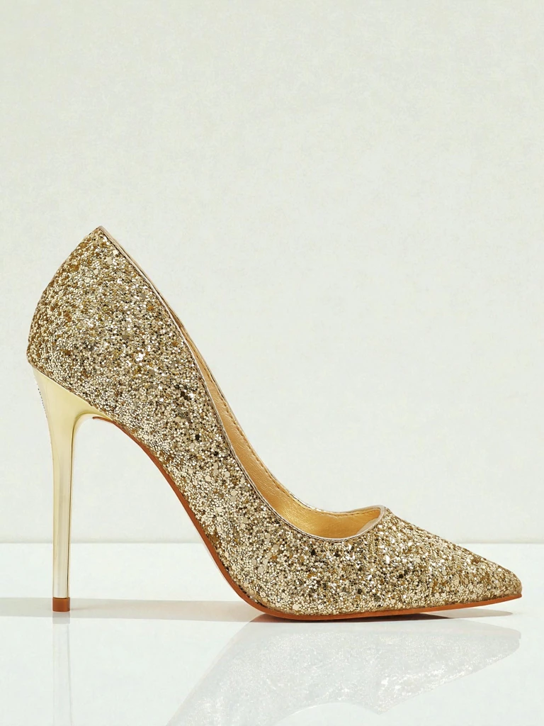 • Női tűsarkú cipő öko bőrből, hegyes orral. Vastagabb, fényes csillámréteggel borítva, ötvözi az eleganciát a finom ragyogással, ideális különleges alkalmakra.