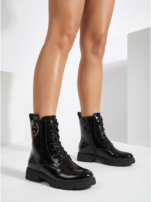 A női worker stílusú bokacsizmák egyedi lábbelik, amelyek ötvözik a stílust és a kényelmet. Lakkozott műbőrből készültek, finom szőrmével béleltek. Fűzős modell cipzárral. A vastagabb talp minden lépésnél kényelmet biztosít.