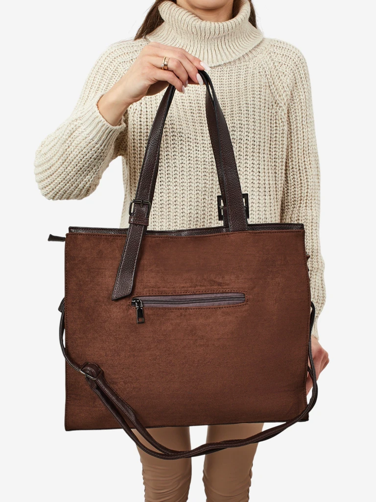 - Elegáns női táska ökológiai velúrbőrből. 1 rekesz elválasztóval, 4 zseb, levehető, állítható pánt. Ideális munkához és mindennapi használatra – tágas, divatos és praktikus.