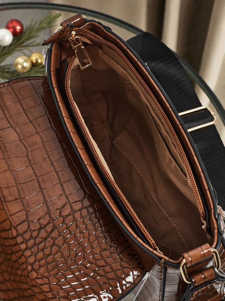 Kicsi, dombornyomott táska lakkozott műbőrből. 1 rekesz, 3 zseb, cipzár és állítható pánt. Stílus és funkcionalitás tökéletes kiadásban.