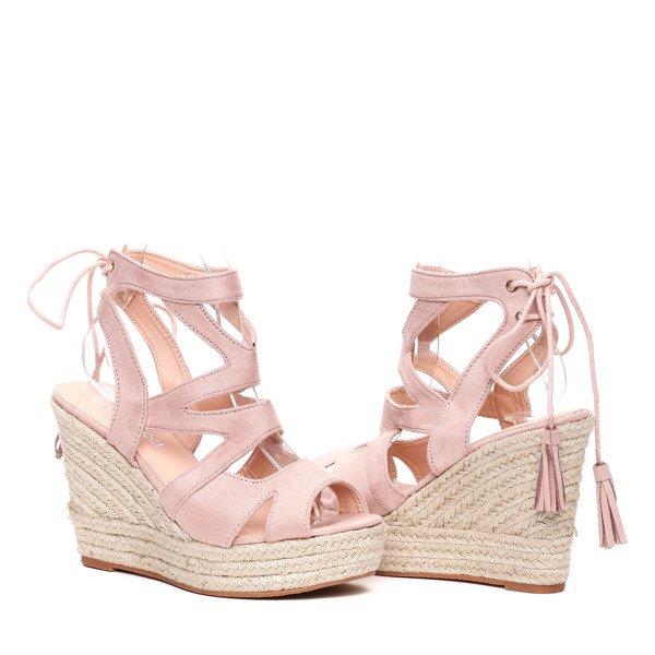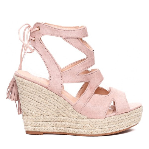• Sandały na koturnie wykonane z ekologicznego zamszu. Cholewka z wycięciami. Obuwie wiązane w tylnej części sznureczkami, które zakończone są frędzelkami. Podeszwa zdobiona sznurkiem jutowym. Sprawdzą się idealnie jako dodatek do sukienek!