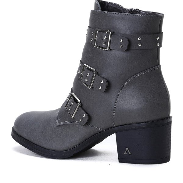 Szare botki na niskim słupku z ozdobnymi sprzączkami Aline - Obuwie