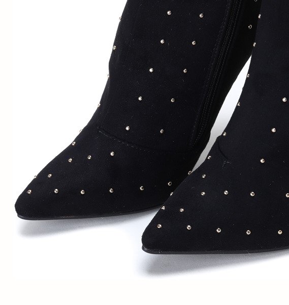 - Ponadczasowe botki na wysokiej szpilce wykonane z ekologicznej skóry zamszowej. Nosek typu szpic. Cholewka zdobiona złotymi dżetami. W środku ocieplenie w formie pianki pokrytej tkaniną. Świetnie się sprawdzą na co dzień jak i na wieczór!