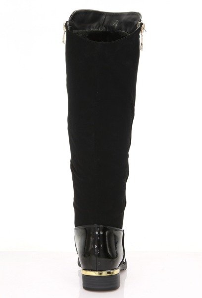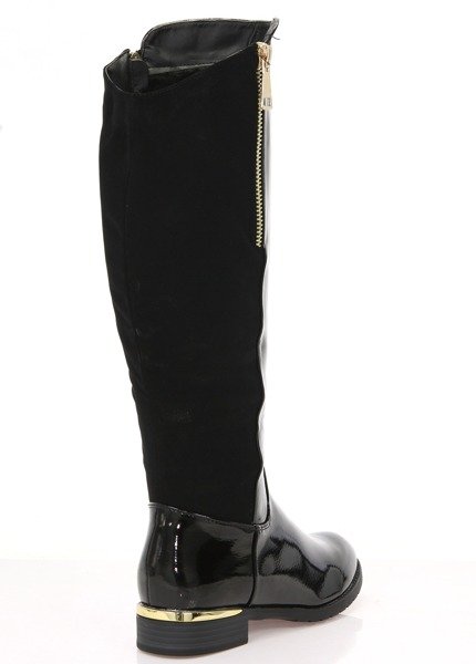 - Klasszikus muskétások ihlette hosszú csizma. A felső felső része matt szintetikus velúr. Dekoratív, arany cipzár és egy aranylemez a sarokban elegáns dizájnt hoznak létre. Bent melegszik.