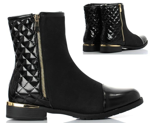 - Ocieplane botki na niskim obcasie. Cholewka połączona dwoma materiałami - syntetycznym lakierem oraz zamszem. Złota blaszka w obcasie idealnie wpasuje się w elegancki design. Ozdobny, złoty suwak.